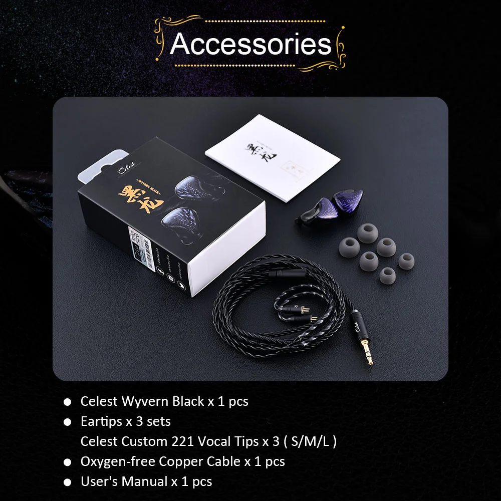 Celest Wyvern Black features a 10mm LCP(Liquid Crystal Polymer) diaphragm dynamic driver unit. It is a new type of polymer diaphragm material featuring a thin and ultra-lightweight design. It produces a clear sound with good extensions and low output distortion. With this customised high-performance dynamic driver, the Wyvern Black delivers a high-resolution detailed sound suitable for most genres.\